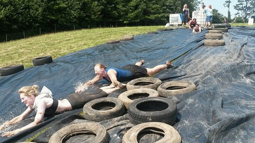 Heather writes –‘I remember lolling about like pigs in mud for the photographer! Also trying unsuccessfully to run with half a tree over my shoulder up a hill, around a vehicle and back. The ‘black widow’ saw us abseiling down a bank on rope netting. Felt like the tin-man trying to climb over what felt like a 10ft high sheet of ply…(obviously being a woman things got in the way) and then even higher bales of straw. Favourite was the Shriner skip of water for a cool down, the huge water slide and the Lune crossing. We crawled up hill, under a net, had to climb through a web of ropes, each of three mud pools got thicker and thicker. Then finally the scary bales like total wipe out balls except you didn’t bounce and the half pipe thing that took me three publicly humiliating attempts to conquer!!